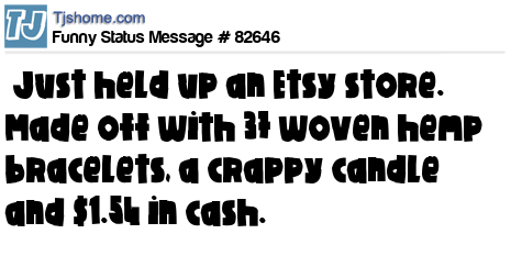 X Just held up an Etsy store. Made off with 37 woven hemp bracelets, a crappy candle and $1.54 in cash.