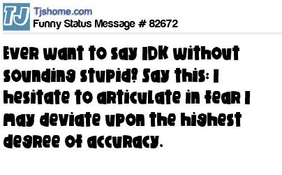 - # 196143 Ever want to say I Don’t Know, without sounding stupid? Say this instead: I hesitate to articulate in fear I may deviate upon the highest degree of accuracy.