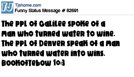 X is The ppl of Galilee spoke of a man who turned water to wine. The ppl of Denver speak of a man who turned water into wins. BookofTebow 10:3