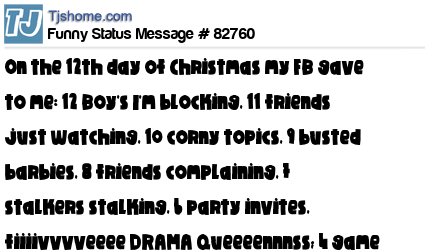 - # 173375 On the 12th Day of Christmas my Facebook gave to me, 12 dudes I'm blocking, 11 friends just watching, 10 corny topics, 9 busted barbies, 8 friends complaining, 7 stalkers stalking, 6 party invites, Fiiiiiiiiiiiiive Drama Queeeensssss,