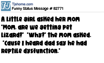 X A little girl asked her mom "Mom, are we getting pet lizard?" "Why?" the mom asked. "Cause I heard dad say he had reptile dysfunction."