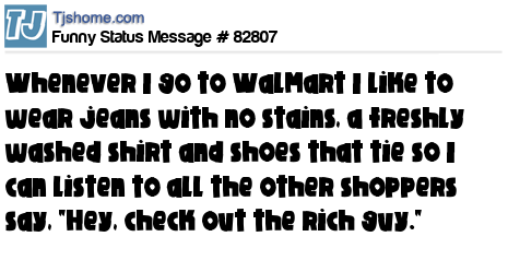 X Whenever I go to WalMart I like to wear jeans with no stains, a freshly washed shirt and shoes that tie so I can listen to all the other shoppers say, "Hey, check out the rich guy."