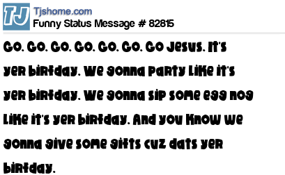 X Go. Go. Go. Go. Go. Go. Go Jesus. It's yer birfday. We gonna party like it's yer birfday. We gonna sip some egg nog like it's yer birfday. And you know we gonna give some gifts cuz dats yer birfday.