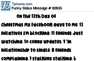 - # 173375 On the 12th Day of Christmas my Facebook gave to me, 12 dudes I'm blocking, 11 friends just watching, 10 corny topics, 9 busted barbies, 8 friends complaining, 7 stalkers stalking, 6 party invites, Fiiiiiiiiiiiiive Drama Queeeensssss,