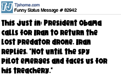 X is This just in: President Obama calls for Iran to return the lost predator drone. Iran replies, "Not until the spy pilot emerges and faces us for his treachery."