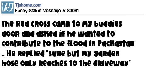 X says The Red Cross camr to my buddies door and asked if he wanted to contribute to the flood in Packastan .. He replied "sure but my garden hose only reaches to the driveway"