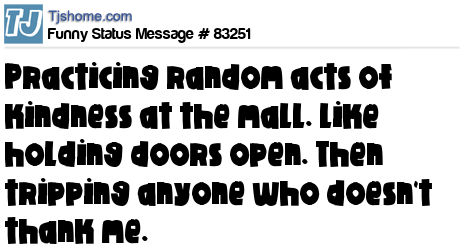 X Practicing random acts of kindness at the mall. Like holding doors open. Then tripping anyone who doesn't thank me.