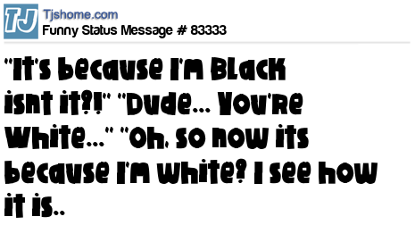 X is ''It's because I'm Black isnt it?!'' ''Dude... You're White...'' ''Oh, so now its because I'm white? I see how it is..