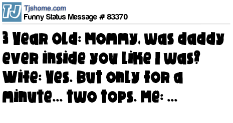 X is 3 Year Old: Mommy, was daddy ever inside you like I was? Wife: Yes. But only for a minute... two tops. Me: ...