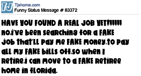 X HAVE YOU FOUND A REAL JOB YET?!!!!! no,i've been searching for a FAKE job that'll pay me FAKE money,to pay all my FAKE bills off,so when I retire,i can move to a FAKE retiree home in florida.