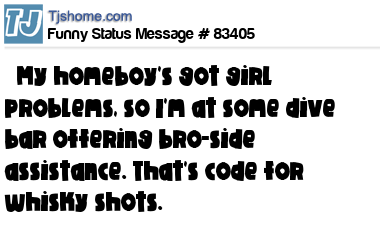 X My homeboy's got girl problems, so I'm at some dive bar offering bro-side assistance. That's code for whisky shots.