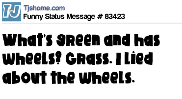 X says What's green and has wheels? Grass. I lied about the wheels.