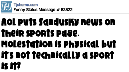X AOL puts Sandusky news on their sports page. Molestation is physical but it's not technically a sport is it?