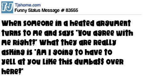 - # 57504 I feel like when someone in a heated argument turns to me and says "You agree with me right?" What they are really asking is "Am I going to have to yell at you like this dumbass over here?"
