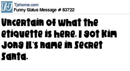 X is uncertain of what the etiquette is here, I got Kim Jong Il's name in Secret Santa.
