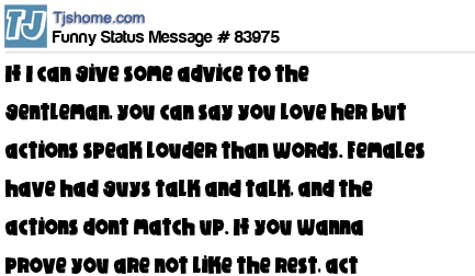 X If I can give some advice to the gentleman, you can say you love her but actions speak louder than words. Females have had guys talk and talk, and the actions dont match up. If you wanna prove you are not like the rest, act like it. Dont just say it.