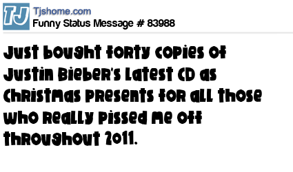 X says Just bought forty copies of Justin Bieber's latest CD as Christmas presents for all those who really pissed me off throughout 2011.