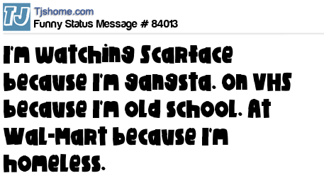 X says I'm watching Scarface because I'm gangsta. On VHS because I'm old school. At Wal-Mart because I'm homeless.