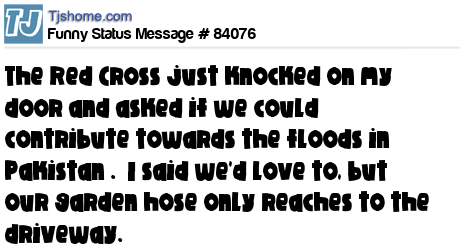 - # 83081 The Red Cross camr to my buddies door and asked if he wanted to contribute to the flood in Packastan .. He replied "sure but my garden hose only reaches to the driveway"