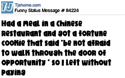 - # 166999 Had Chinese Food last night & my fortune cookie read, "Be not afraid to walk through the door of opportunity"; so I left the restaurant without paying.