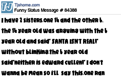 X i have 2 sisters,one 14 and the other 6. the 14 year old was arguing with the 6 year old and said" SANTA ISN'T REAL!" without blinking,the 6 year old said"neither is edward cullen!" I don't wanna be mean so i'll say this,one ran away crying.