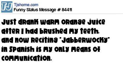 X Just drank warm orange juice after I had brushed my teeth, and now reciting "Jabberwocky" in Spanish is my only means of communication.