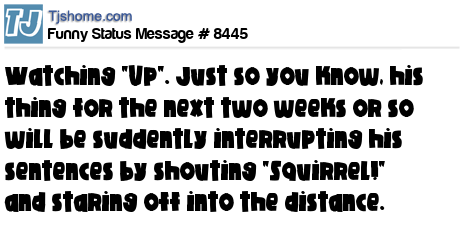 X is watching "Up". Just so you know, his thing for the next two weeks or so will be suddently interrupting his sentences by shouting "Squirrel!" and staring off into the distance.