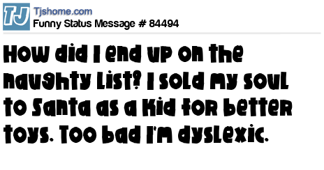 X How did I end up on the naughty list? I sold my soul to Santa as a kid for better toys. Too bad I'm dyslexic.