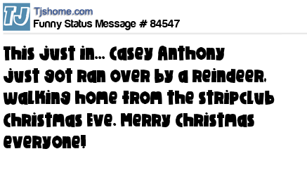X This just in... Casey Anthony just got ran over by a reindeer, walking home from the stripclub Christmas Eve. Merry Christmas everyone!