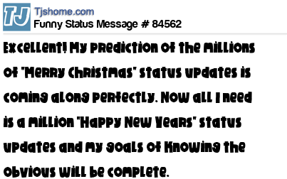 X Excellent! My prediction of the millions of "Merry Christmas" status updates is coming along perfectly. Now all I need is a million "Happy New Years" status updates and my goals of knowing the obvious will be complete.