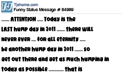 X ....... ATTENTION ..... Today is the LAST hump day in 2011 ....... there will never ever .... for all eternity ..... be another hump day in 2011 ....... so get out there and get as much humping in today as possible ............. that is all .... you may n