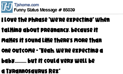 X I love the phrase "we're expecting" when talking about pregnancy, because it makes it sound like there's more than one outcome - "Yeah, we're expecting a baby.......... but it could very well be a Tyrannosaurus Rex"