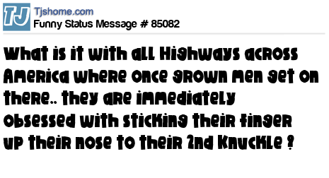 X says What is it with all Highways across America where once grown men get on there.. they are immediately obsessed with sticking their finger up their nose to their 2nd Knuckle ?