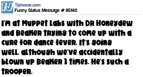 X I'm at Muppet labs with Dr Honeydew and Beaker trying to come up with a cure for dance fever. It's going well, although we've accidentally blown up Beaker 3 times. He's such a trooper.