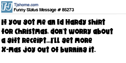 X says If you got me an Ed Hardy shirt for Christmas, don't worry about a gift receipt...I'll get more X-mas joy out of burning it.
