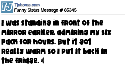 - # 173823 I was standing in front of the mirror earlier, admiring my six pack. It got really warm though so I put it back in the fridge..