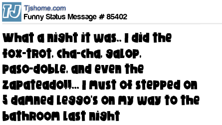 X what a night it was.. I did the fox-trot, cha-cha, galop, paso-doble, and even the zapateado!!... I must of stepped on 5 damned leggo's on my way to the bathroom last night