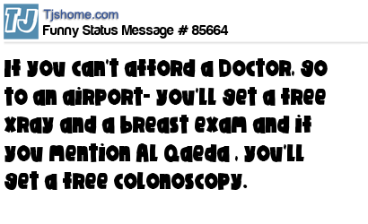 - # 47102 If you can't afford a doctor, go to an airport. You'll get a free x-ray, a breast exam, and if you mention Al Qaeda you will get a free colonoscopy