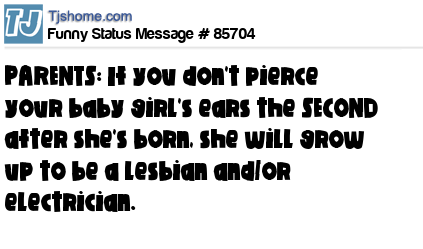 X PARENTS: If you don't pierce your baby girl's ears the SECOND after she's born, she will grow up to be a lesbian and/or electrician.