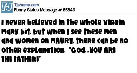X I never believed in the whole Virgin Mary bit, but when I see these men and women on MAURY, there can be no other explanation. "God...YOU ARE THE FATHER!"