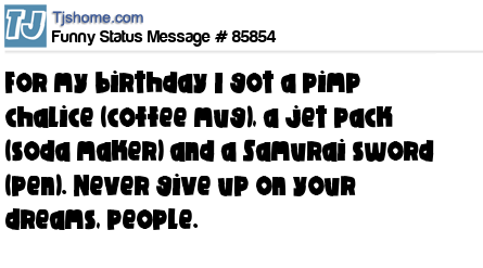 X For my birthday I got a pimp chalice (coffee mug), a jet pack (soda maker) and a Samurai sword (pen). Never give up on your dreams, people.
