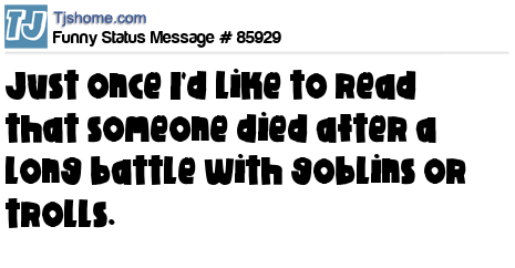 X says Just once I'd like to read that someone died after a long battle with goblins or trolls.