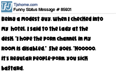 X Being a modest guy, when I checked into my hotel, I said to the lady at the desk, "I hope the p0rn channel in my room is disabled." She goes, "Nooooo, it's regular people-p0rn, you sick ba$tard.”