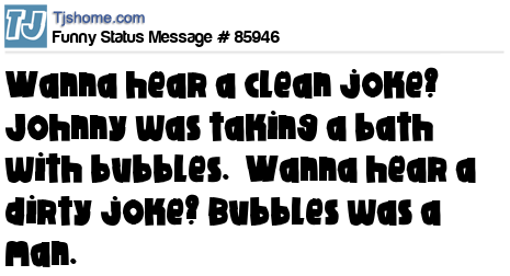 X says Wanna hear a clean joke? Johnny was taking a bath with bubbles. Wanna hear a dirty joke? Bubbles was a man.