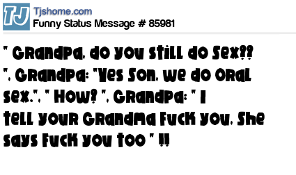 X " Grandpa, do you still do Sex?? ", Grandpa: "Yes Son, we do Oral sex.", " How? ", Grandpa: " I tell your Grandma Fuck you, She says Fuck you too " !!