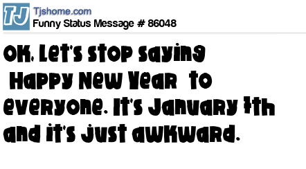 - # 191062 After the 7th day of January. Please keep your "Happy New Year" messages to yourself. We probably, have already cried, been depressed, been angry at someone, eaten leftover food more than once and paid an unexpected bill. It's no longer new or happy.
