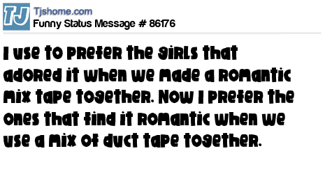 X I use to prefer the girls that adored it when we made a romantic mix tape together. Now I prefer the ones that find it romantic when we use a mix of duct tape together.