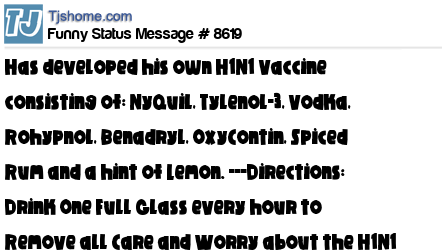 X has developed his own H1N1 Vaccine consisting of: NyQuil, Tylenol-3, Vodka, Rohypnol, Benadryl, OxyContin, Spiced Rum and a hint of Lemon. ---Directions: Drink One Full Glass every hour to Remove all Care and Worry about the H1N1 virus.....