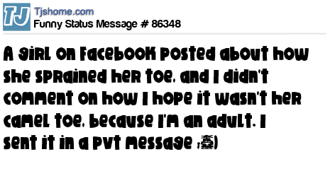 X A girl on Facebook posted about how she sprained her toe, and I didn't comment on how I hope it wasn't her camel toe, because I'm an adult. I sent it in a pvt message ;~)