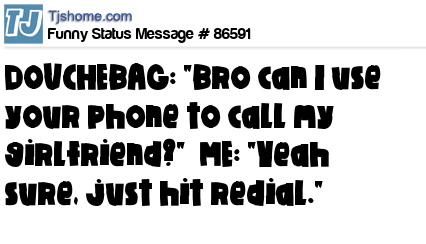 X says DOUCHEBAG: "Bro can I use your phone to call my girlfriend?" ME: "Yeah sure, just hit redial."